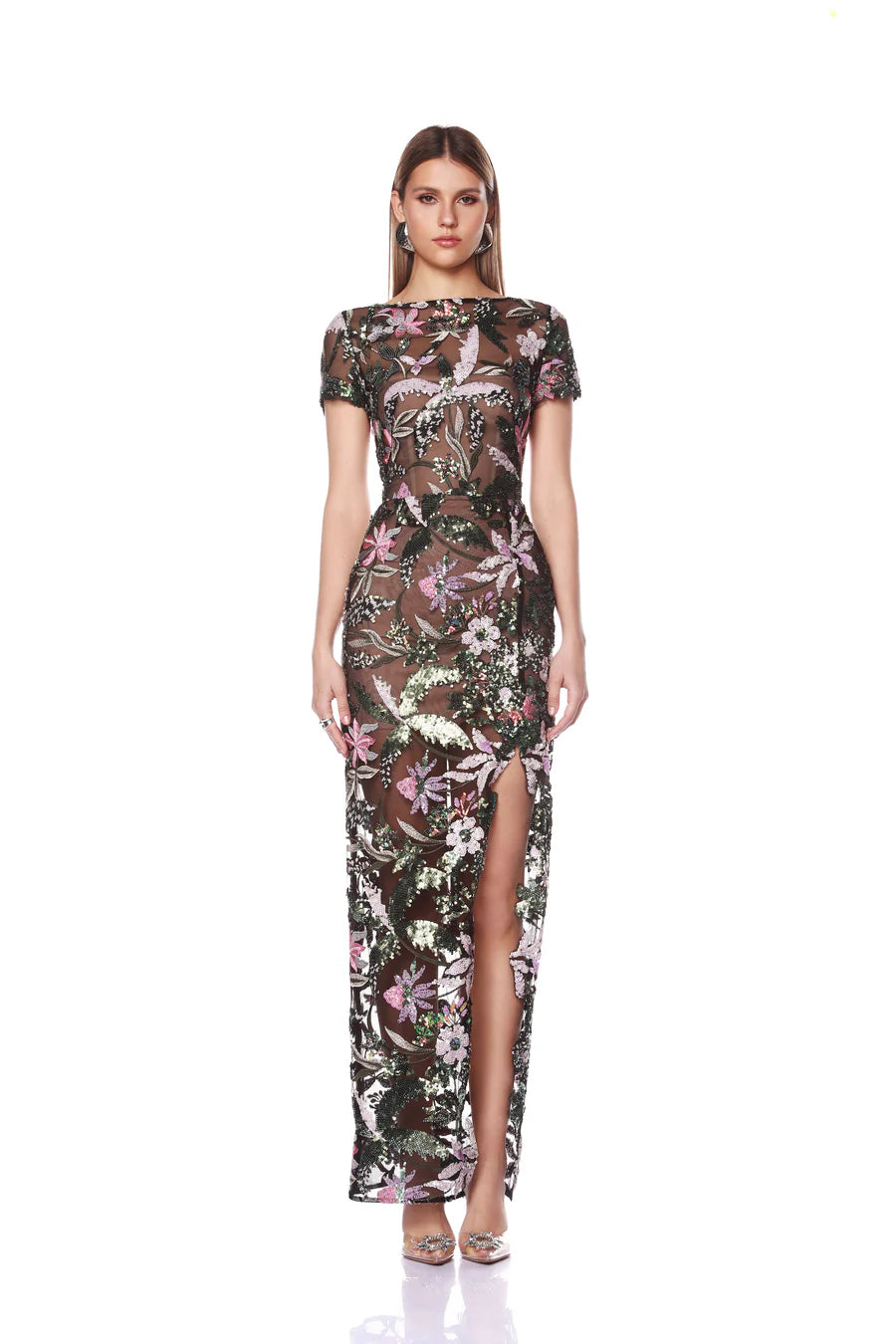 Embody sophistication with the Zinna Embroidered Gown, adorned with intricate sequin appliqué and finished with a high leg slit.