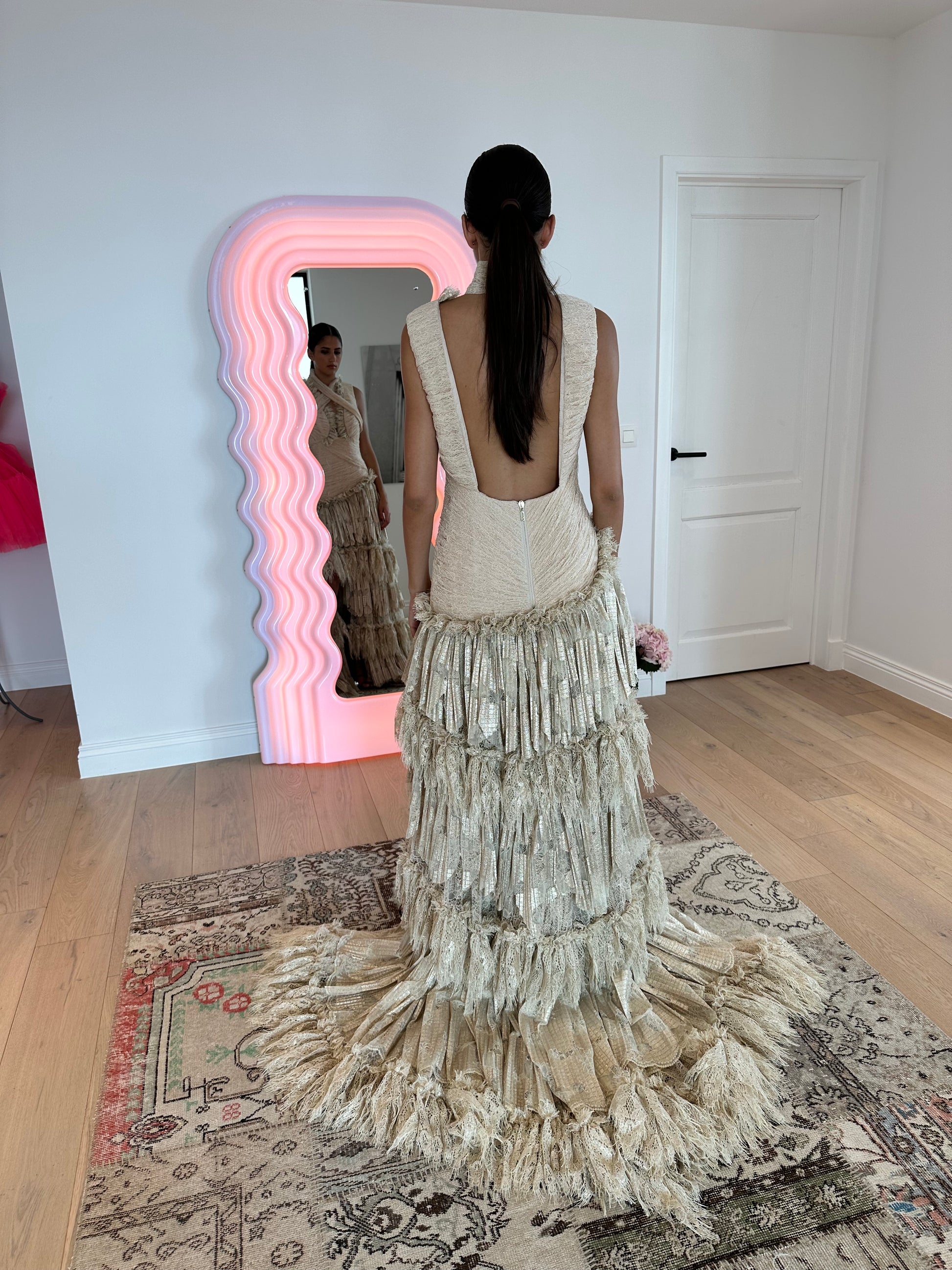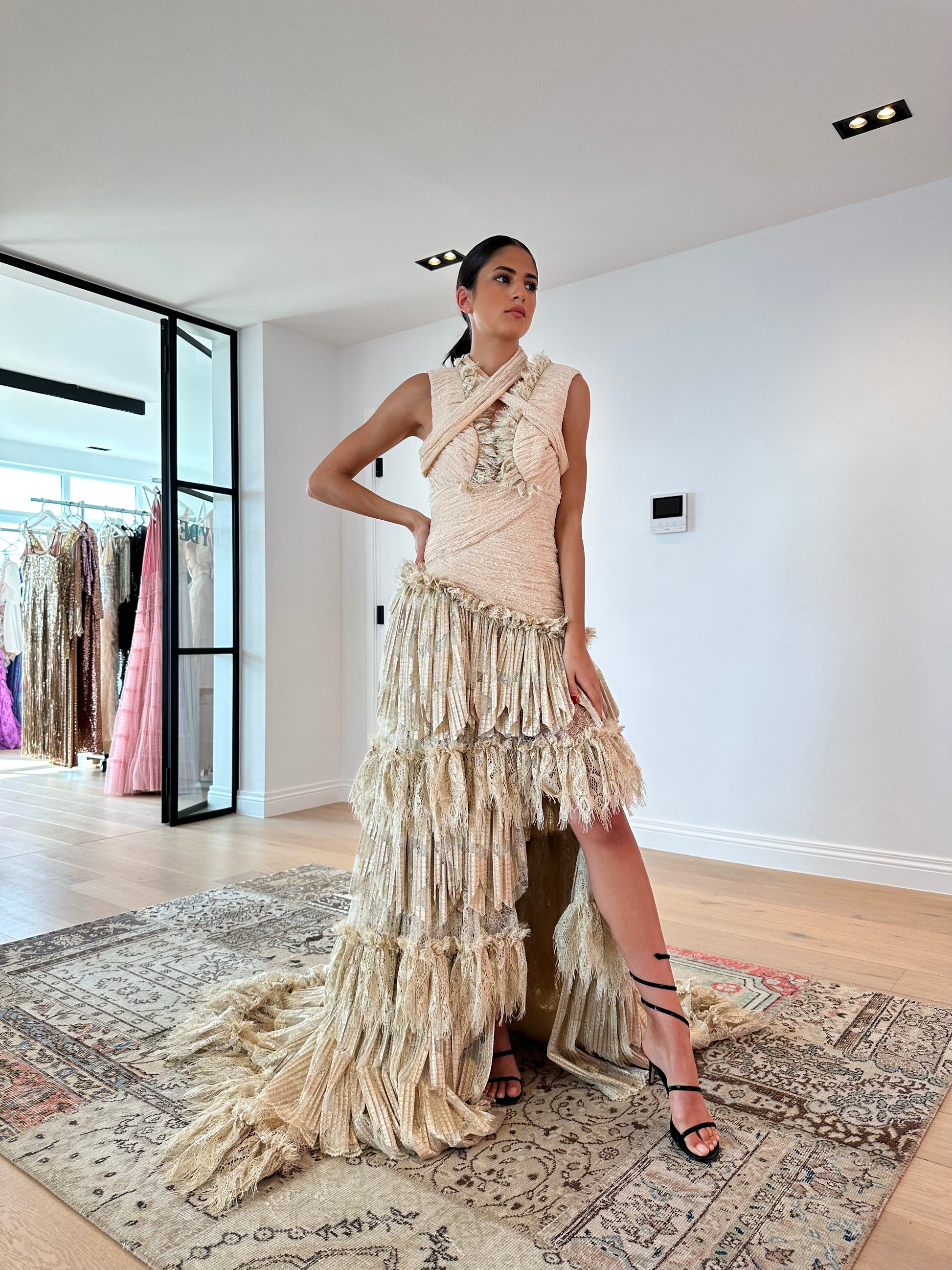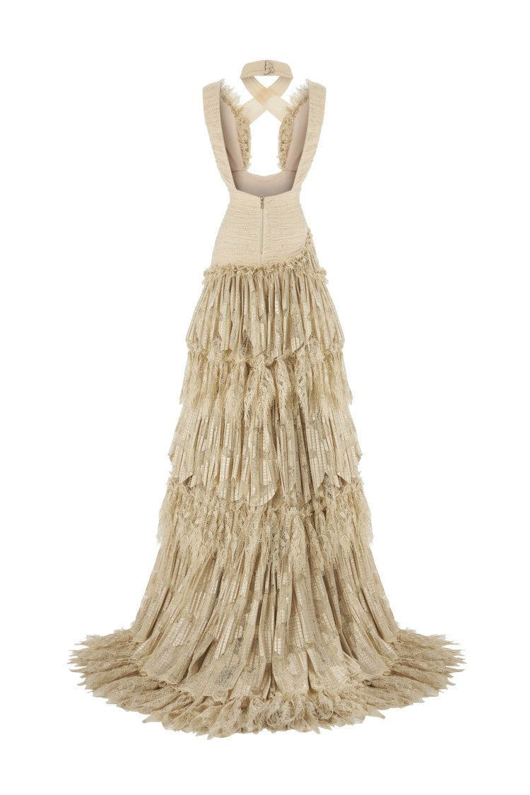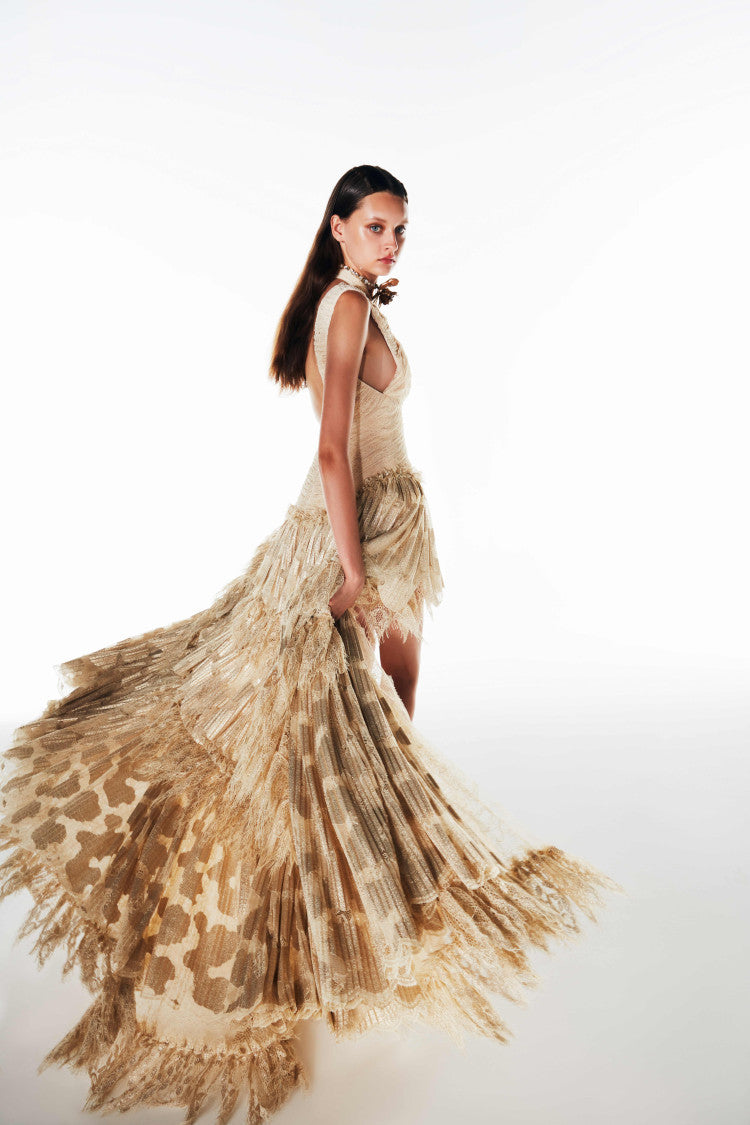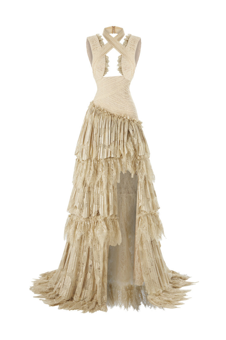 Gold beige lace fabric on bust and gold beige with gold foil print fabric on skirt Cut-out details on front