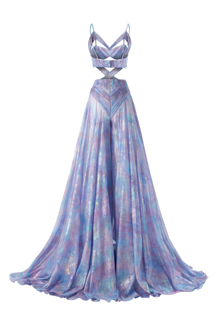 Extra loose leg maxi jumpsuit made from floral print and foil prited tulle fabric