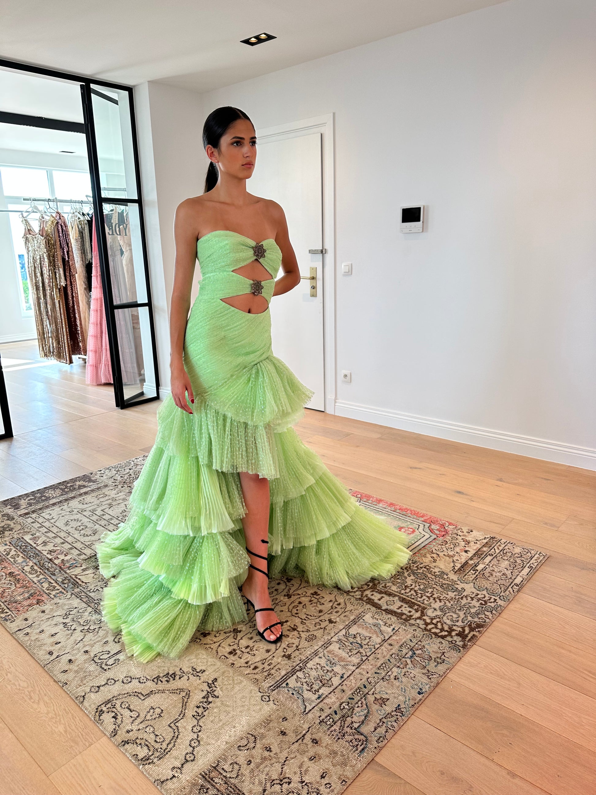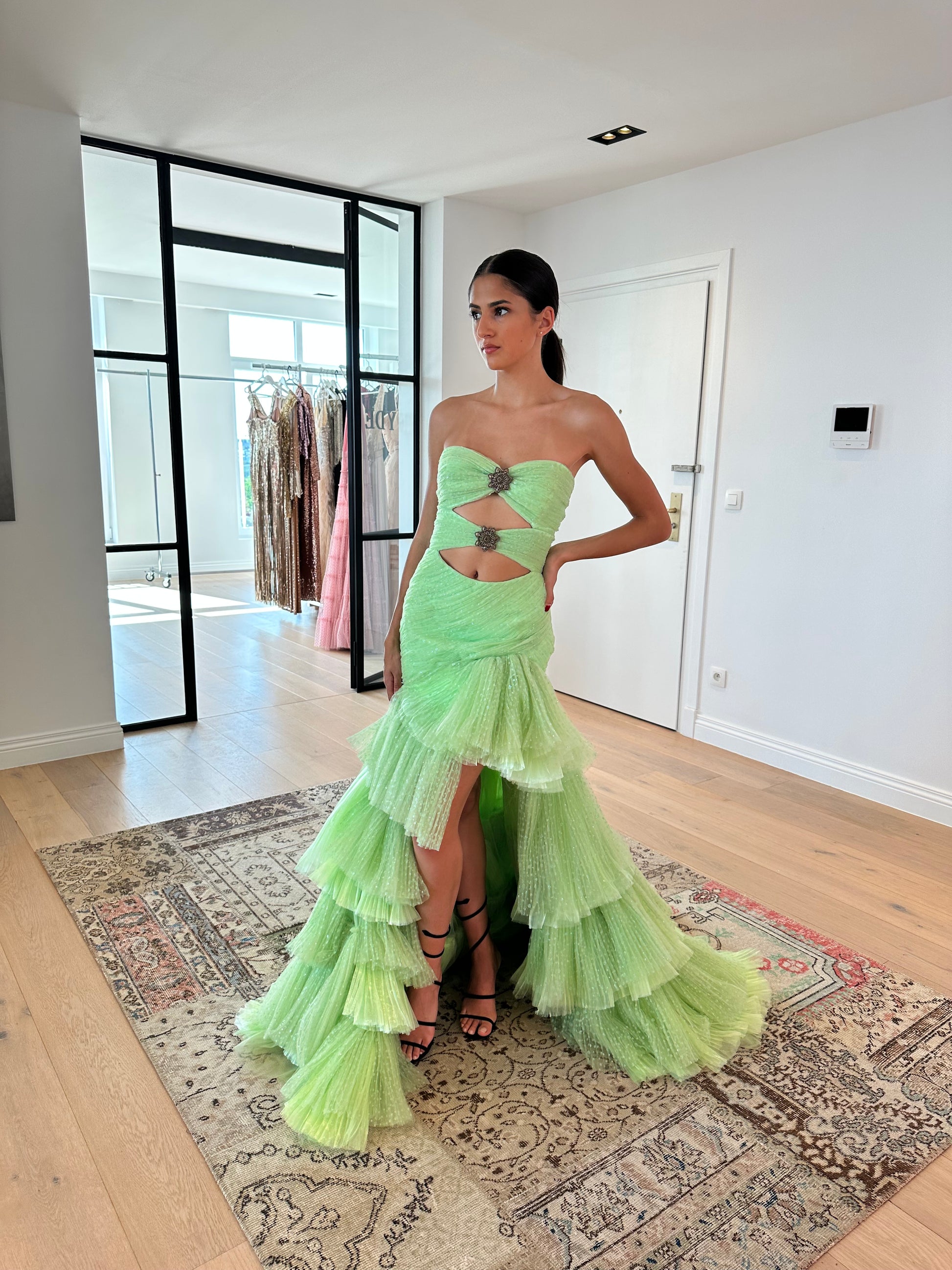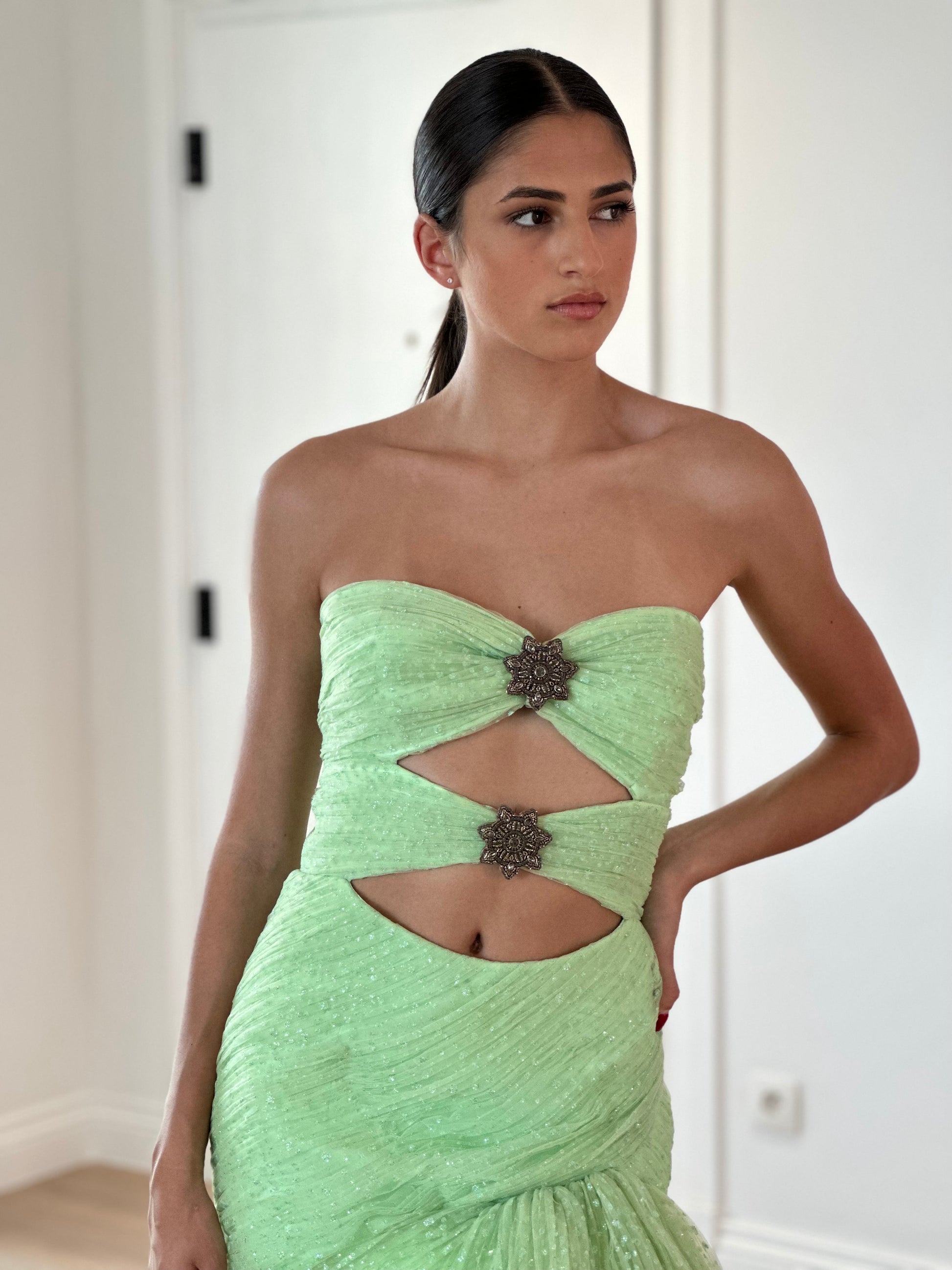 Strapless maxi skirt 3 cut-out details on fornt with brooshes 2 cut-out details at the back