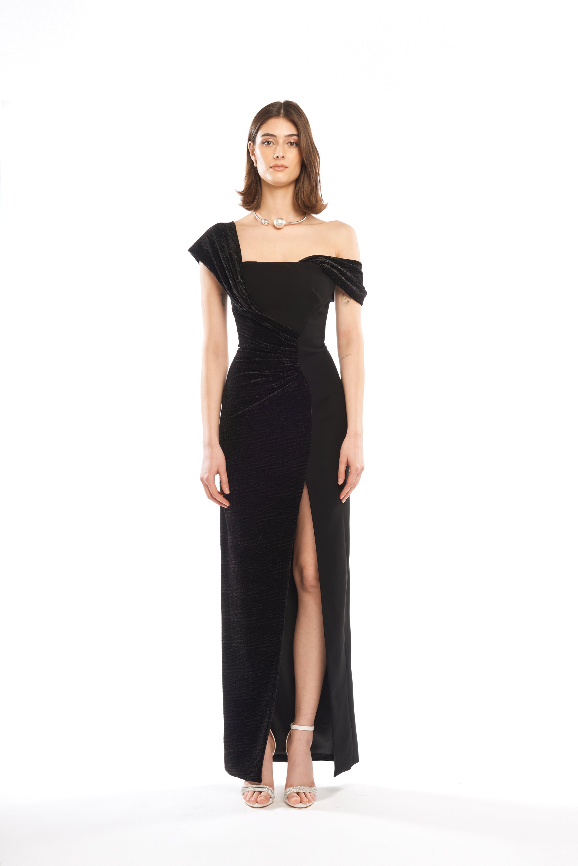 A reinvented classic black dress with a velvet draped shoulder and sensual side slit for an unforgettable look.