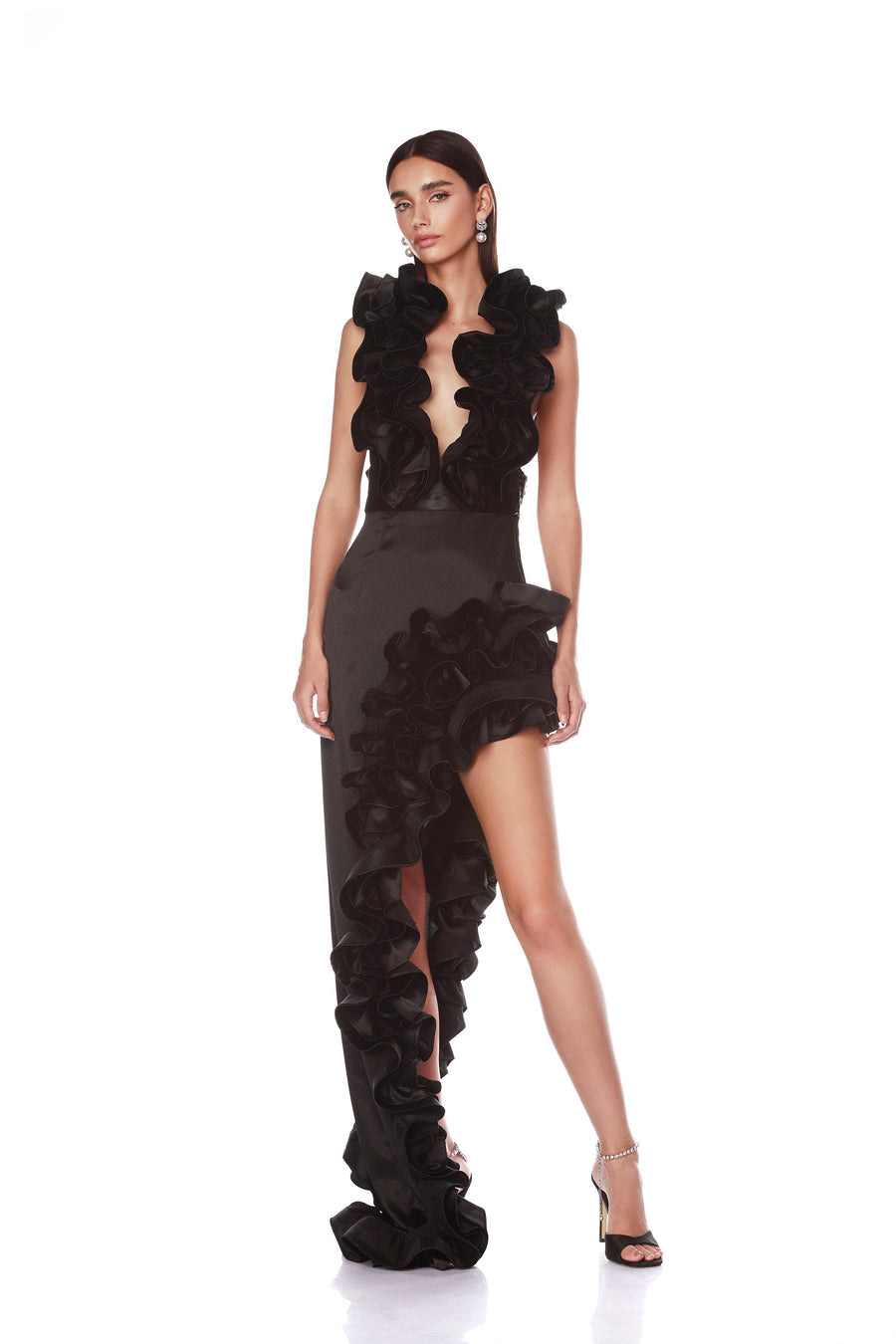 Capture attention in our Aurora Noir Gown, featuring striking floral detail straps that add a touch of romance.