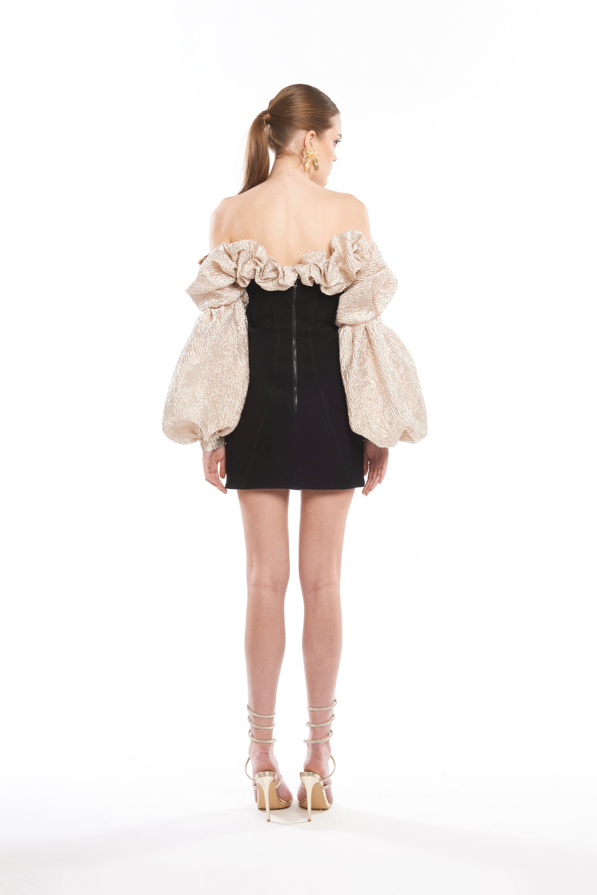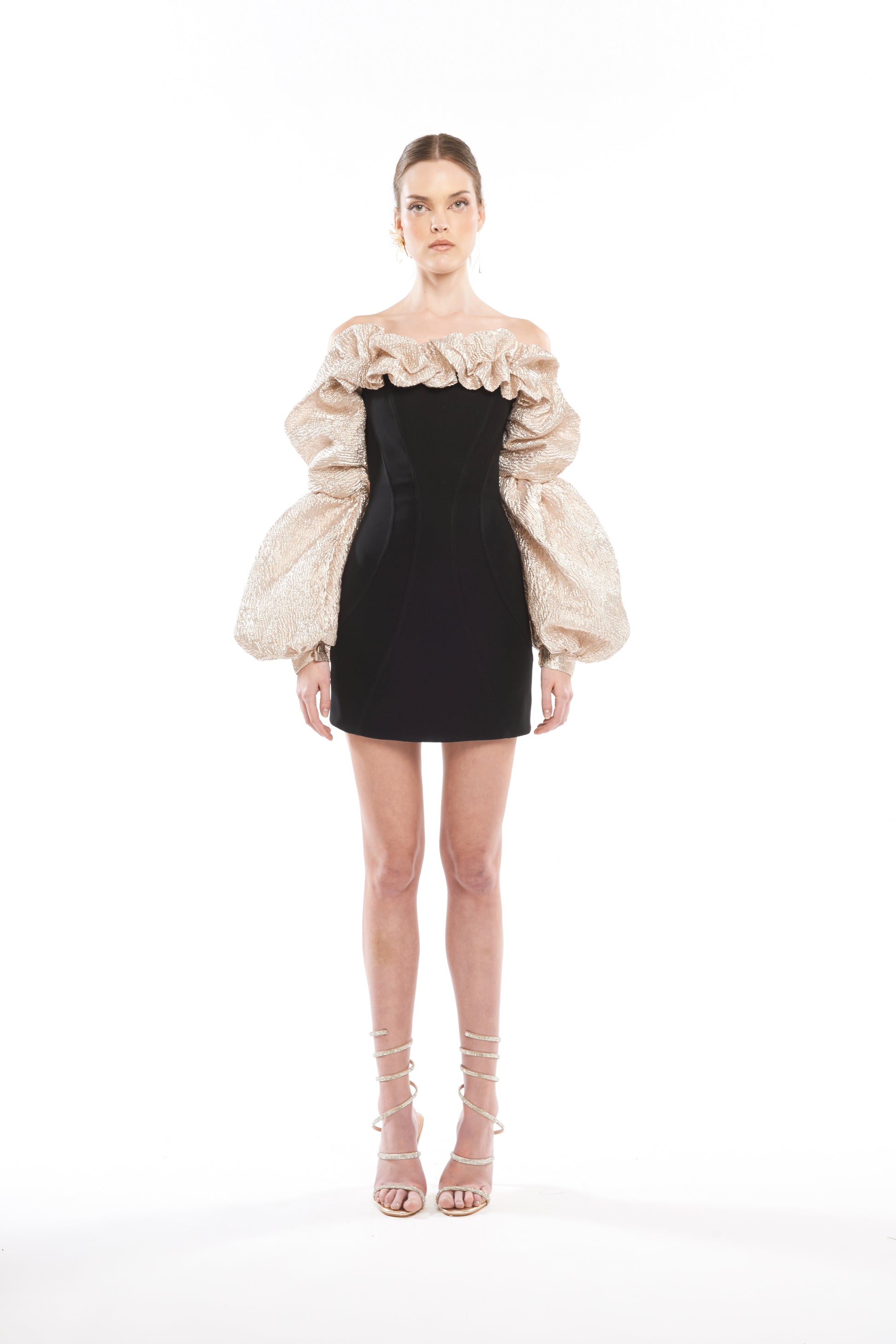 With a stunning sparkling wave shoulder, this mini dress features an elegant off-shoulder design and fitted silhouette. A classic, with a breath of life.
